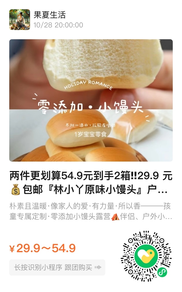 现在,购买两袋仅需54.9元,您可以带回2箱新鲜的小馒头!这款小馒头,不仅是您的户外干粮、零食选择,它同样也能为您的早餐增添一抹温馨。简简单单的口感,清新自然的味道,都是为了让您每一天都充满力量与能量。无论是单独食用还是搭配牛奶,都是一天的好开始。