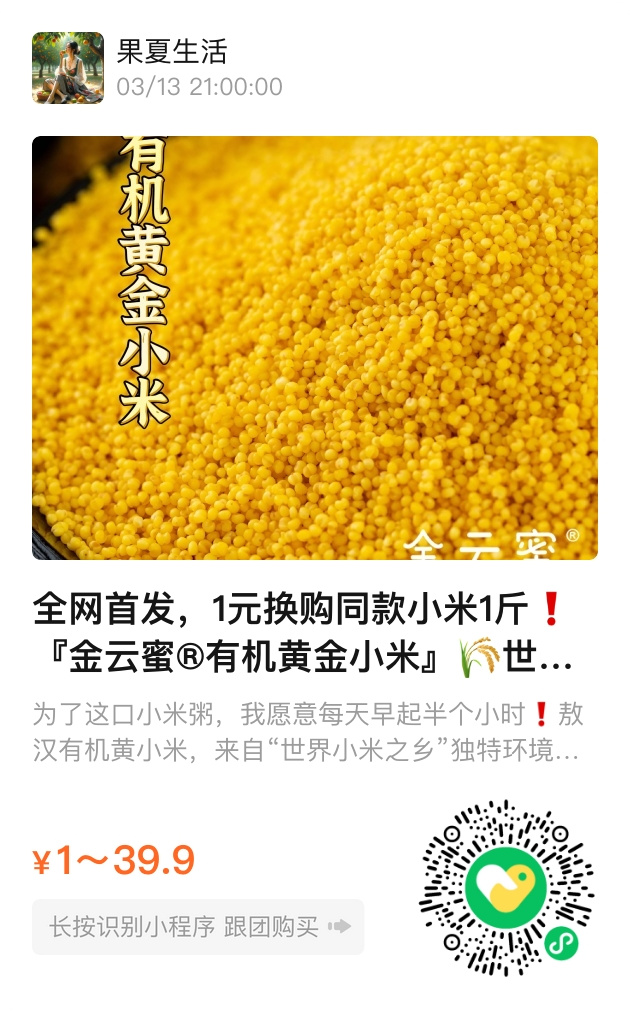 现在,金云蜜有机黄金小米首次亮相,购买即可享受首发福利。活动期间,只需加1元,即可换购同款1袋小米,温暖这个冬天,不容错过。