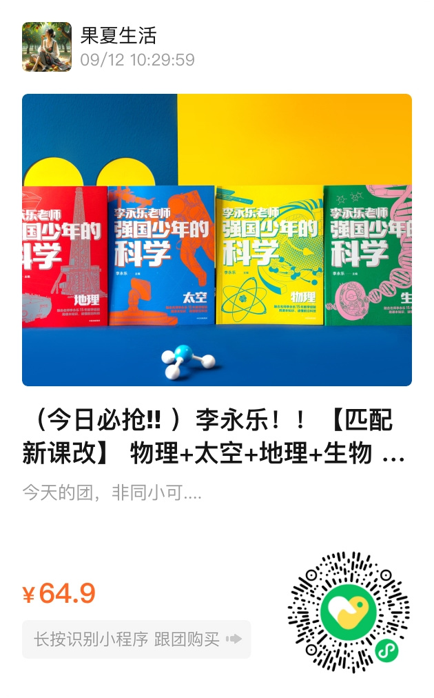 总结来说,《李永乐 强国少年的科学》系列是为孩子量身定制的一套学习资料。无论您是为了应对新教材的变化,还是为了培养孩子对科学的兴趣,这套书都能成为孩子学习路上的有力助手。今天加入这个团购,您将以超值的价格,获得四本书和一套专属课程,帮助孩子走在时代的前沿。