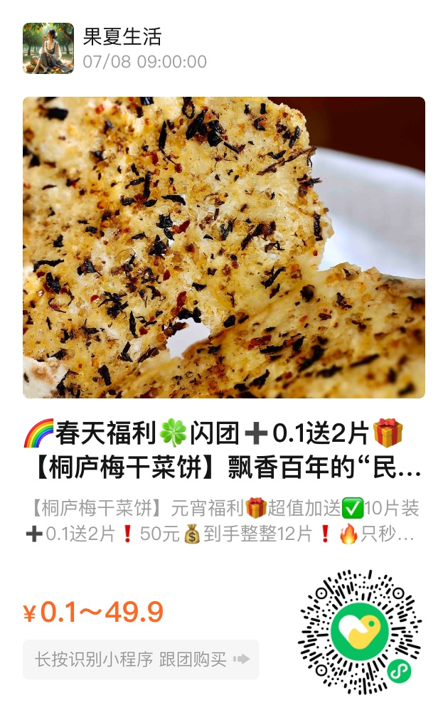活动期间,我们特别为您准备了春季福利活动——购买10片装即可享受加赠2片的超值优惠,49.9元到手整整12片!无需排队,无需出门,足不出户也能品尝到地道的桐庐梅干菜饼。无论是作为日常小吃,还是家人朋友聚会时的共享美味,都是绝佳的选择。活动仅限9天,赶紧抓住这个难得的机会,让美味不再等待!