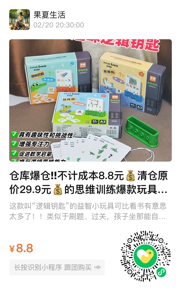 现在,这款玩具正在进行清仓大促销,原价29.9元的“逻辑钥匙”,现仅售8.8元。库存有限,机会难得,赶紧行动起来,给孩子一个充满智慧与乐趣的成长礼物吧!