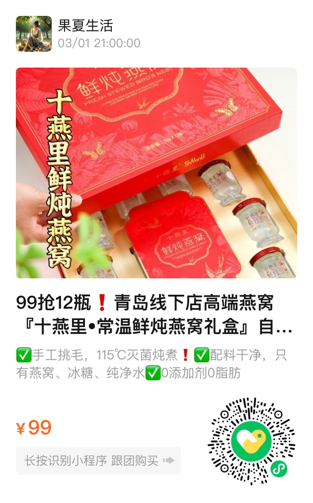 总结来说,十燕里鲜炖燕窝以其优质的原料、传统的制作工艺和真诚的品牌承诺,成为了现代消费者理想的滋补选择。无论是日常补养还是节日馈赠,它都能为你的生活增添一份温暖与营养。记得趁着优惠活动,好好犒劳自己和亲朋好友,享受这一份来自大自然的馈赠。
