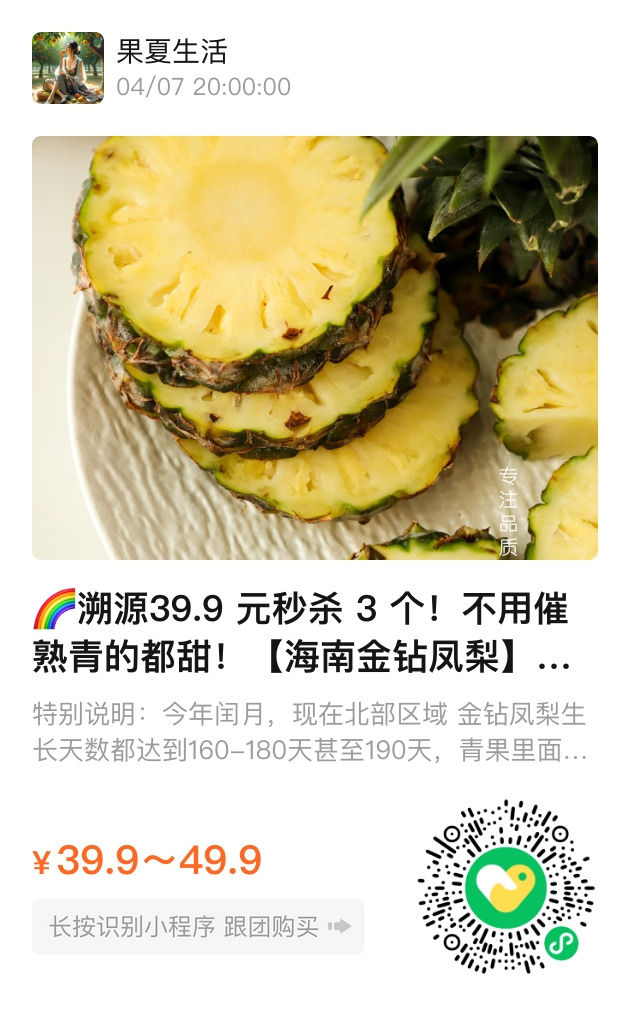 为了回馈广大的支持者,我们正在举办一个限时秒杀活动!只需49元,即可获得三颗优质海南金钻凤梨,足够满足您与家人的需求。我们对品质有信心,也希望您能感受到我们对每一位客户的重视与支持。让我们一起享受这份来自海南的天然美味吧!