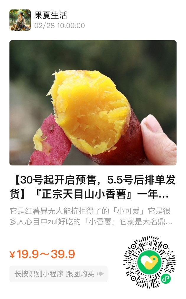 为了让大家能尽享这一季的美味,我们将在5月5号后开始排单发货,确保每一颗小香薯都保持最佳的口感。现在开始,预售已经正式开启,每一份都将为您带来纯净自然的滋味。天目山小香薯,值得您与家人一同分享,感受这份来自大山的深情厚意。