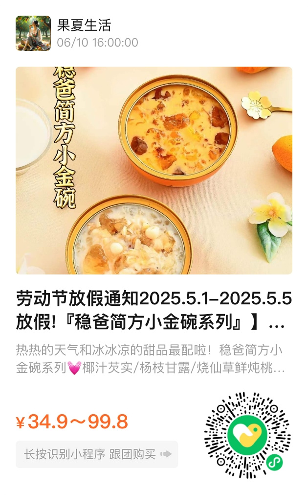 在这个特别的假期里,我们真诚希望稳爸简方的每一碗甜品都能给你带来一份愉悦。无论是忙碌的工作后,还是想要享受片刻宁静的时光,我们的甜品都是你的理想选择。希望通过这次活动,你能感受到我们的用心和对你的关爱。