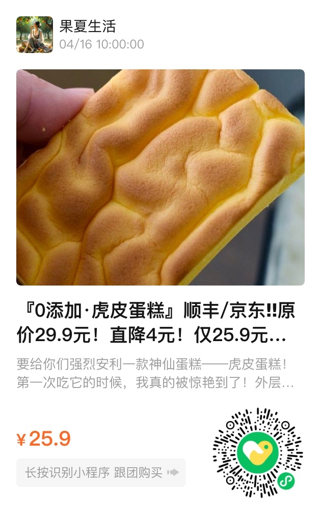 活动期间,这款0添加·虎皮蛋糕,原价29.9元,现直降4元,仅需25.9元一盒,随时可能结束。400克约18小块,金黄虎皮纹理,入口即化的柔软细腻,送自己、送家人都非常合适。