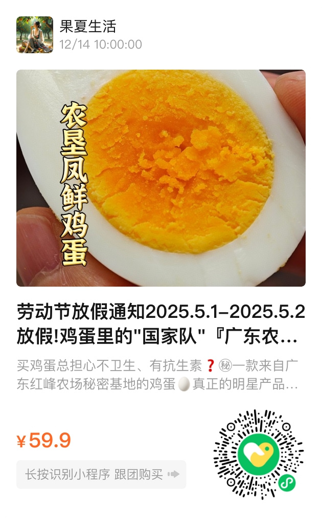 现在正值五一假期,大家都该吃得好、休息好。2025年5月1日至5月2日放假期间,广垦凤鲜鸡蛋开启限时活动,诚意满满,只为让更多人体验一颗“国家队”水准的好鸡蛋。