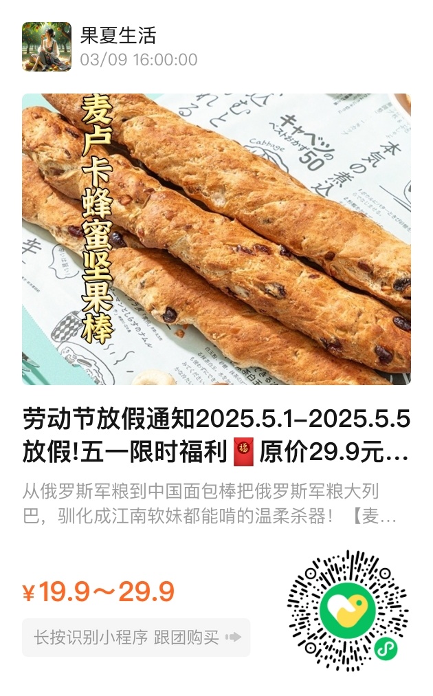 五一限时秒杀活动:原价29.9元/盒,限时秒杀19.9元/盒,一盒3根,柔软巨香,现烤直发!2025年5月1日至5月5日限时抢购!