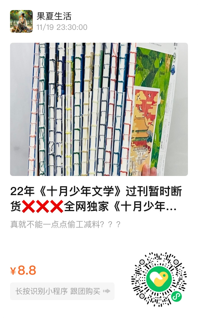 别小看这次的过刊清仓,每一本都有独立编号,内容饱满,插画精良——超100页的内容,每一页都不曾糊弄。主编不惜高价请作家首发新作,脊锁线工艺一丝不苟,只为一件事:不能在孩子的文学启蒙上偷工减料。现在下单,单本只需8.8元,三本起购,六本起还送价值19.9元的线下联名帆布袋。