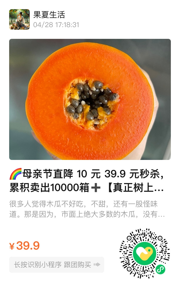 我们知道,每一份水果都承载着一个家庭的期待。特别是母亲节,想送的不是“礼物”,而是那份用心挑选的诚意。所以,这次我们特意准备了感恩活动:🌸母亲节直降 10 元,39.9 元秒杀,真正树上熟的冰糖心木瓜,已累计售出超 10000 箱!