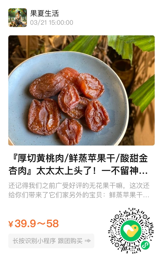 活动内容: 现在,正值新品上市之际,我们为大家带来了超值的购买活动。厚切黄桃肉、鲜蒸苹果干、酸甜金杏肉三款新品组合,享受限时优惠,品味自然,感受健康与美味的双重滋养。