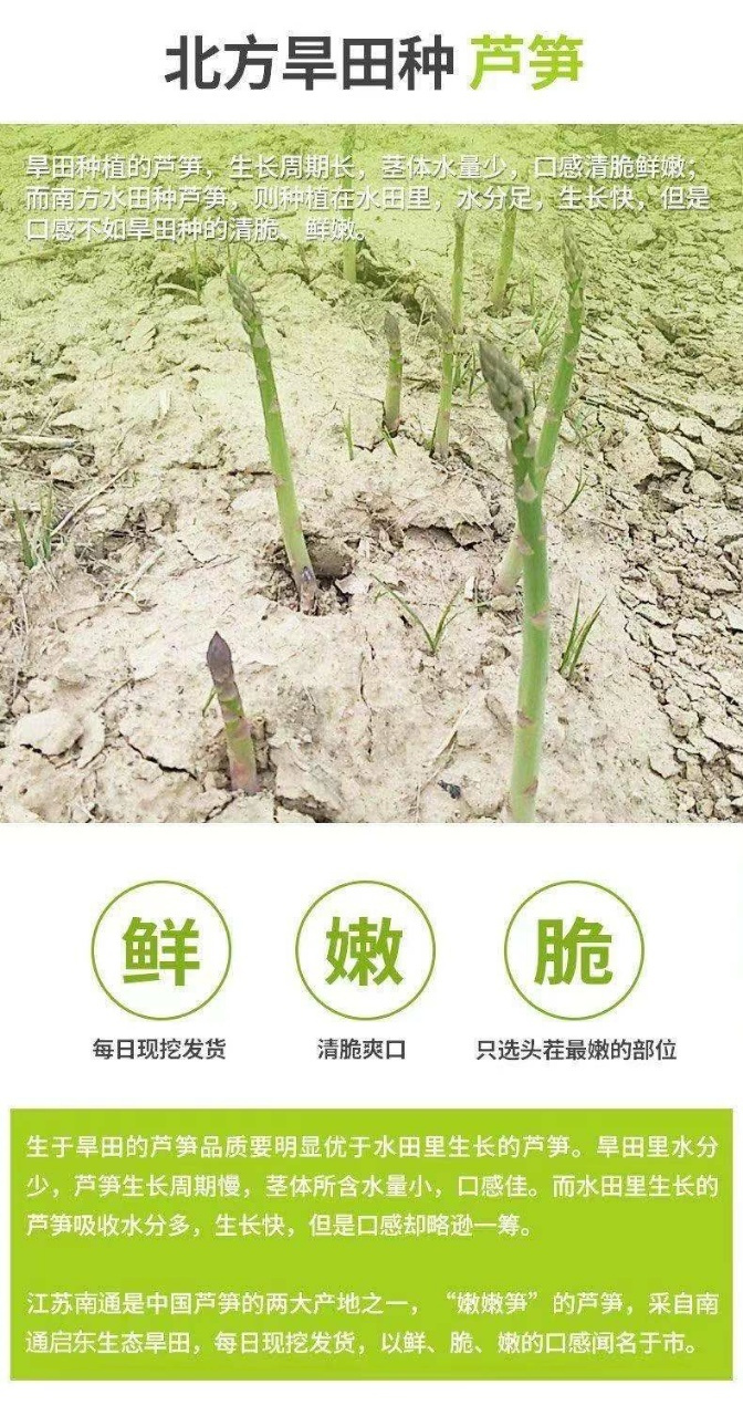 我们了解,很多消费者在选购芦笋时会有所犹豫,担心品质是否符合期待。选择“笋满分”头茬青芦笋,您不必担心这些问题。所有的芦笋均来自江苏南通启东的旱田生态种植基地,采用自然生长方式,无农药、无化学催熟剂,每一根都自然健康。经过精心包装,确保每一口芦笋的鲜美到达您的餐桌时,依然保持原始的口感和营养。