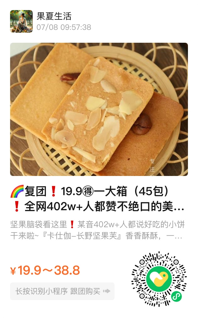 为了让更多人能够体验到这款美味零食,现在我们特别推出了复团活动,限时只需19.9元即可拥有一大箱(45包)的坚果芙。无论是日常小食还是办公室零食,它都能为你带来一份简单的幸福。在这个忙碌的季节,不妨为自己和家人准备一份,品味这份坚果与蛋香的温暖。
