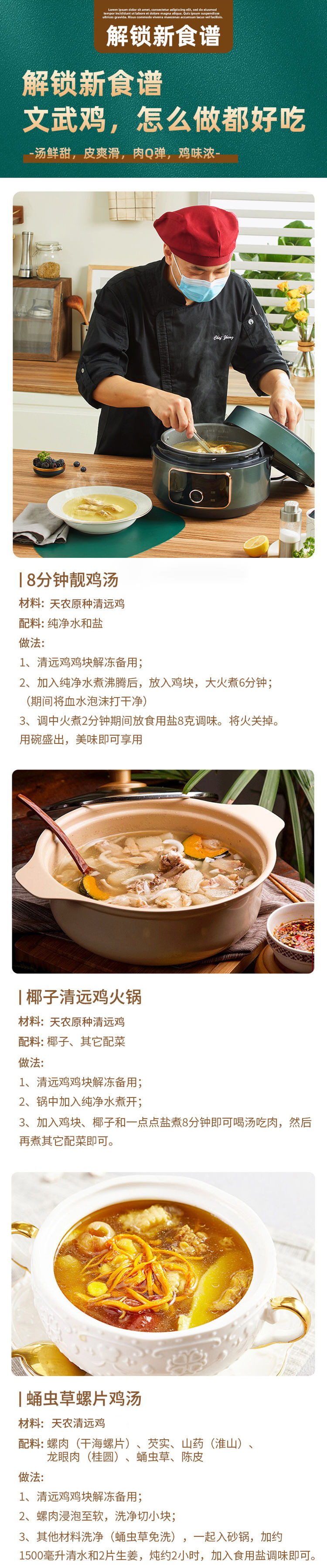 我们知道,选择一款好鸡是多么重要。市面上充斥着各种鸡肉产品,但天农正宗原种清远鸡与其他普通鸡肉相比,明显具备更高的品质保证。天农清远鸡自带鲜美,水开8分钟,简单调味,就能做出一锅鲜香四溢的鸡汤。这种便捷与高效,不仅节省时间,也让日常烹饪变得更加轻松愉快。我们了解您对食材的挑剔,而天农正宗原种清远鸡正是您对品质的追求最佳体现。