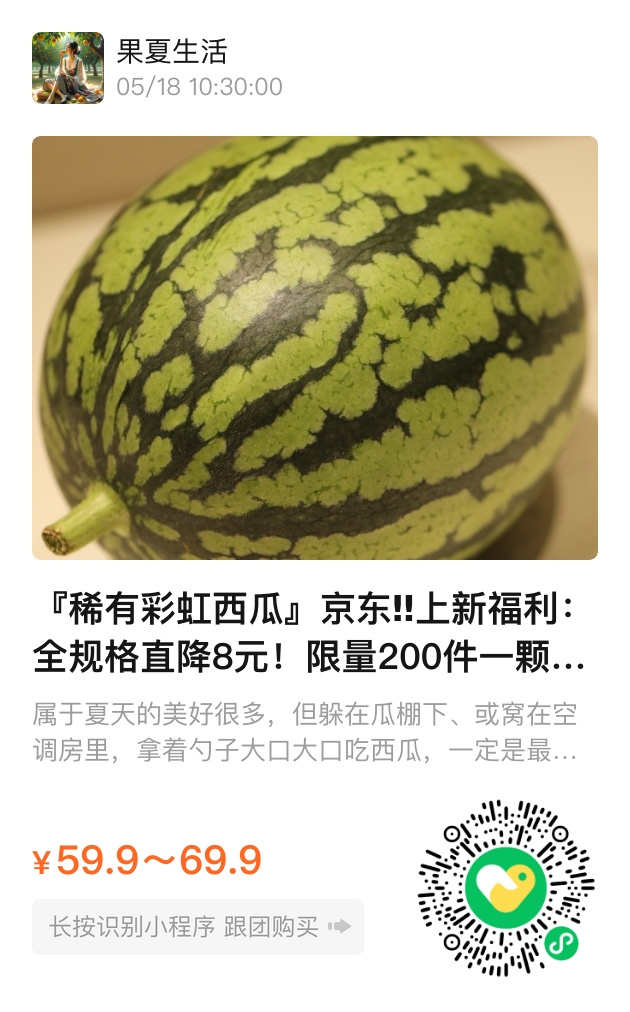 现在购买稀有彩虹西瓜,全规格直降8元,限量200件,错过了这次,你或许就要等上一整年。赶紧抓住这个夏天的机会,让这颗精灵般的西瓜为你的味蕾带来一场清凉与甜美的盛宴!