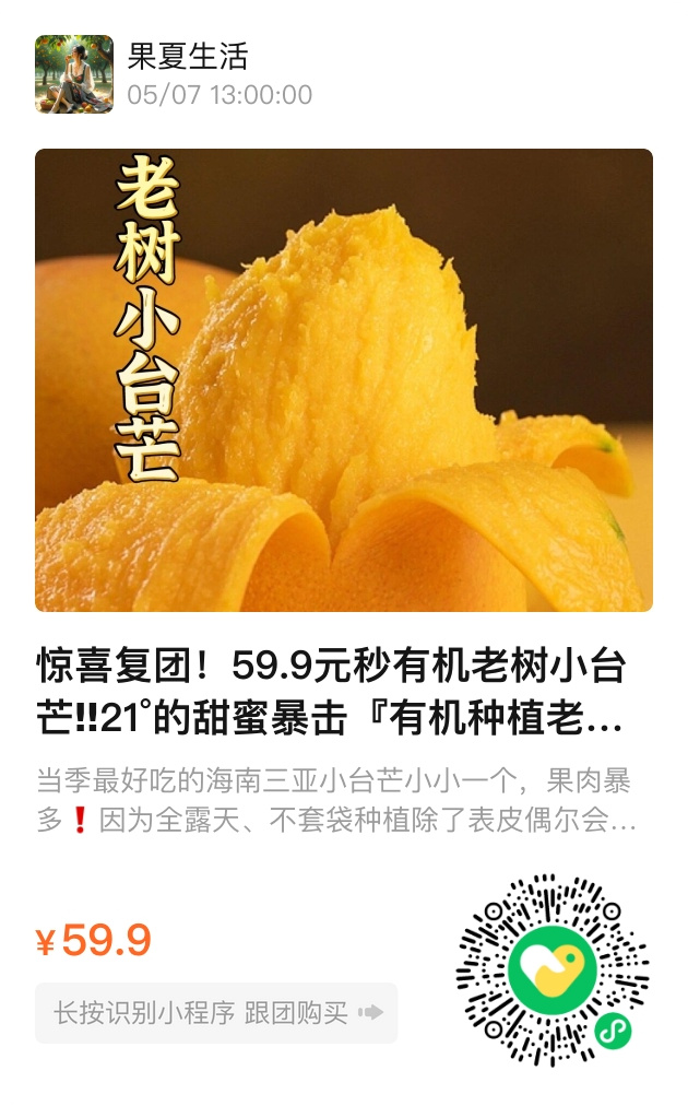 为了让更多的朋友们品尝到这一份特别的美味,我们正在进行一场特别的活动。仅需59.9元,你就能拥有这份从三亚果园直发的美味——有机种植的老树小台芒。每一颗小台芒都承载着果农20年的心血与坚持,香甜的滋味,定能让你爱上它的每一口。活动期间,顺丰包邮,送货到家,让你享受最便捷的购物体验。抓紧时间,不要错过这次绝佳的机会!