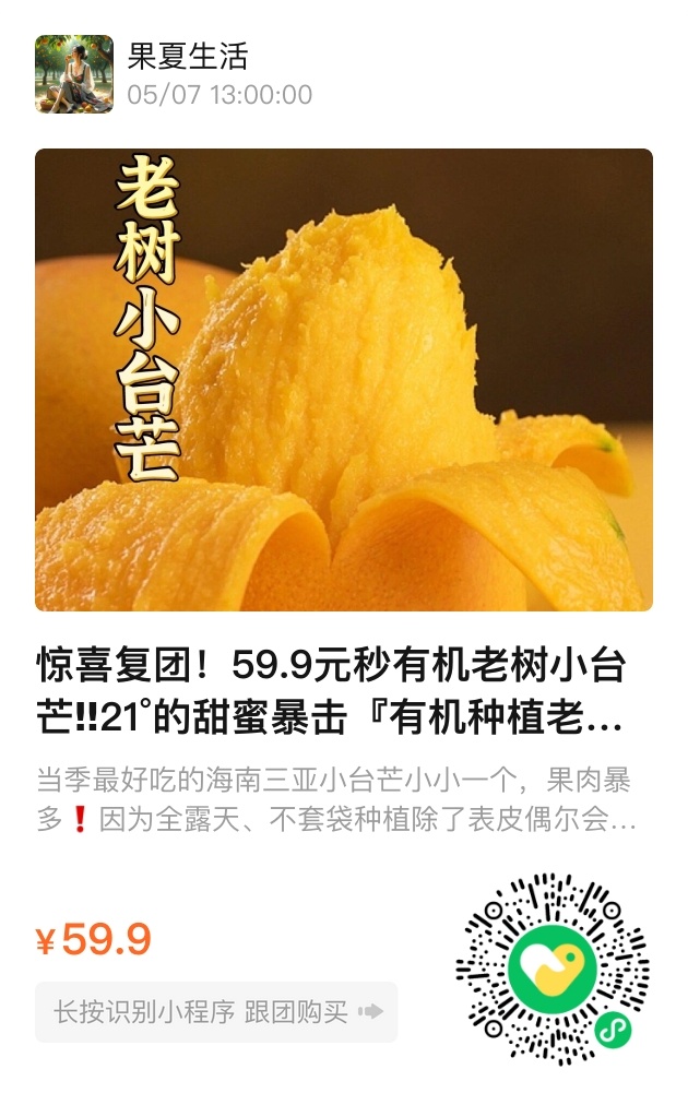 如果你正寻求一款让你感受到“吃一口就停不下来”的芒果,这款有机种植的老树小台芒无疑是最佳选择。它不仅能满足你的味蕾,更能带给你健康与营养。现在,只需59.9元,你就能尝到来自海南三亚的天然美味,享受这份来自热带阳光的甜蜜。活动期间购买,快递包邮,数量有限,赶紧来体验这份独特的美味吧!