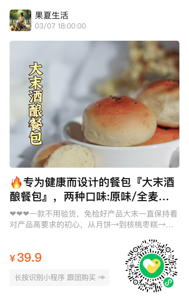 为了回馈大家的喜爱,现在购买大末酒酿餐包,无论是原味还是全麦,我们都为您提供特别的优惠活动。每份餐包都采用独立包装,方便携带,让你随时随地享受美味。趁着这次活动,带上一份大末酒酿餐包,温暖你的每一天。