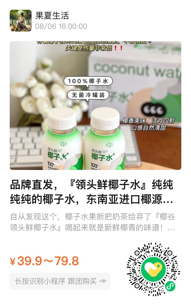 这款椰子水以其独特的口感和健康属性,成为了很多人日常生活中的好伴侣。它没有香精、色素、添加剂,完全纯粹,只要你喜欢清新的味道,这瓶椰子水将会带给你非凡的享受。如果你也想试试这份来自东南亚的自然馈赠,现在就点击链接,带上几瓶『领头鲜椰子水』,让你的每一天都充满清爽与活力!