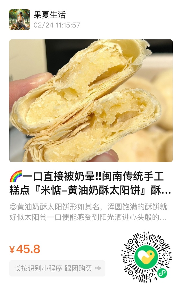 活动期间,这款黄油奶酥太阳饼正在进行限时开团,原价28.9元的单盒,现在只需45.8元即可获得两盒,机会难得,快来品尝这份来自老街的温暖滋味吧!