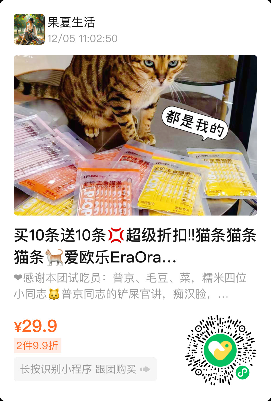 现在,爱欧乐EraOra猫条正举行超值活动,团购3袋仅需39.9元,折扣力度堪比超市特卖,毛孩子们的美味大餐,绝对值得一试。无论是挑食的猫咪,还是消化敏感的老年猫,这款猫条都能轻松应对。无胶质、无防腐剂,让每一根猫条都充满自然的鲜香与美味,真正做到“让猫咪吃得放心,铲屎官省心”。赶快为你的毛孩子准备一份营养满分的猫条吧!