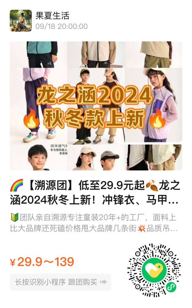 为了让更多家庭体验到龙之涵的优质童装,我们特意推出了此次团购活动,价格最低可达29.9元起。全新秋冬系列,已经为您的宝贝准备好,适合不同年龄段的孩子,连家长的尺码也能找到,亲子装无压力。