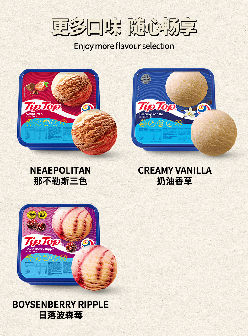 为了让更多的朋友能体验到这种美味,TIPTOP推出了买一送二的超值活动,2L大盒装,足够全家人一起分享。你不仅能享受到新西兰原装进口的顶级品质,还能品尝到经典的三种口味:那不勒斯三色、日落波森莓、经典香草,酸甜、香浓、清新,满足你不同的味蕾需求。活动限时五天,趁着这个机会,带回家,和家人一起共享这份来自新西兰的甜蜜与纯净吧。