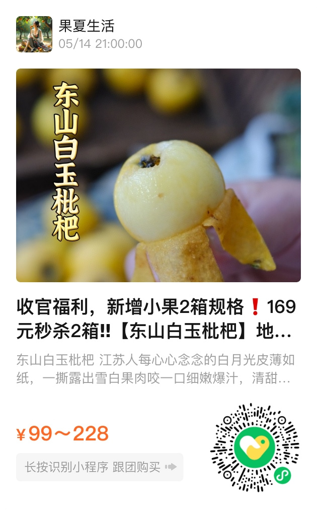 这次,我们特别加推收官福利:东山白玉枇杷169元秒杀2箱,小果2箱装火热上线。数量有限,售完即止。