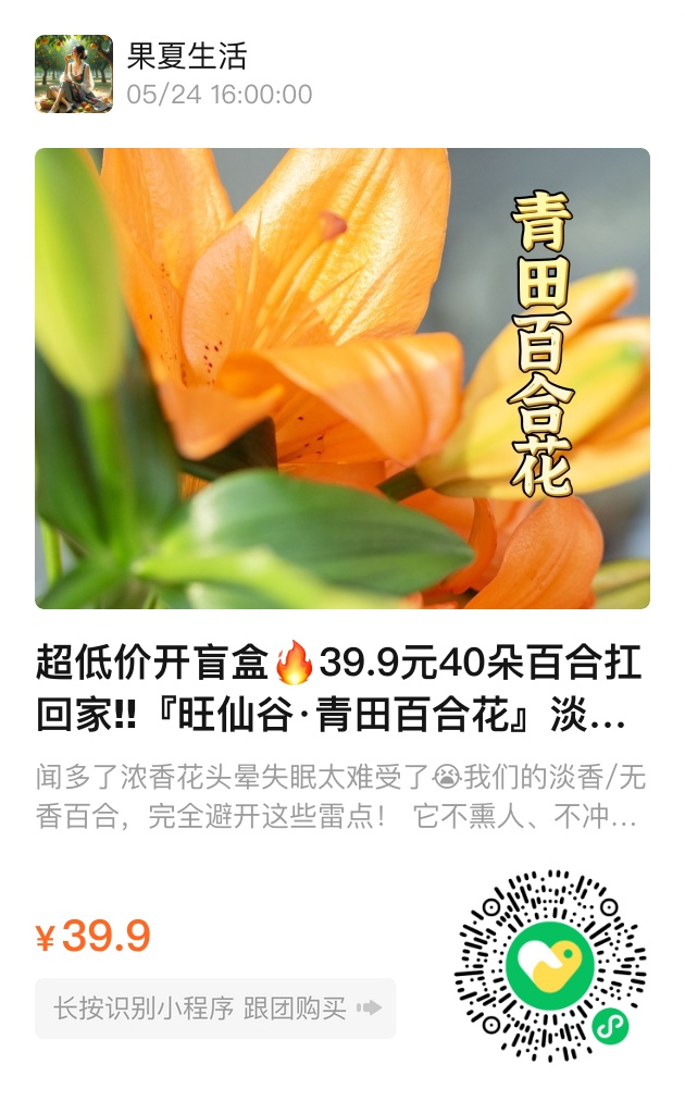 🌸活动说明:本次超值盲盒团购《旺仙谷·青田百合花》,仅39.9元可得8枝混色百合,保底40个花苞。浙江青田产地直发,淡香/无香,十几种品种随机发货,随缘开盒,清新不冲鼻。数量有限,错过可惜。