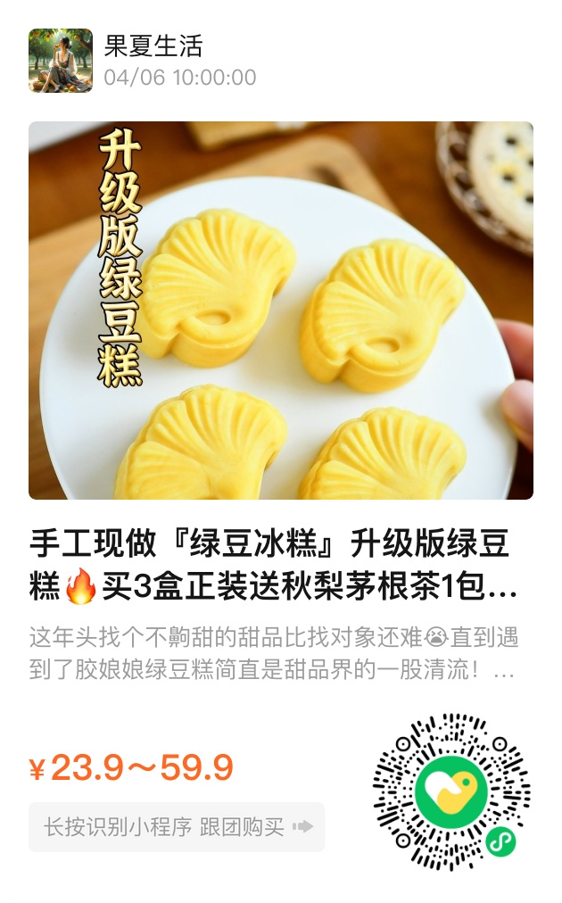总结:这款绿豆冰糕没有复杂的口号,只有真材实料和用心工艺。清爽不甜腻,配料干净,冷藏后更是像绿豆冰淇淋般细腻沁凉。买3盒正装绿豆冰糕送1包秋梨茅根茶(80g),数量有限,诚意满满。