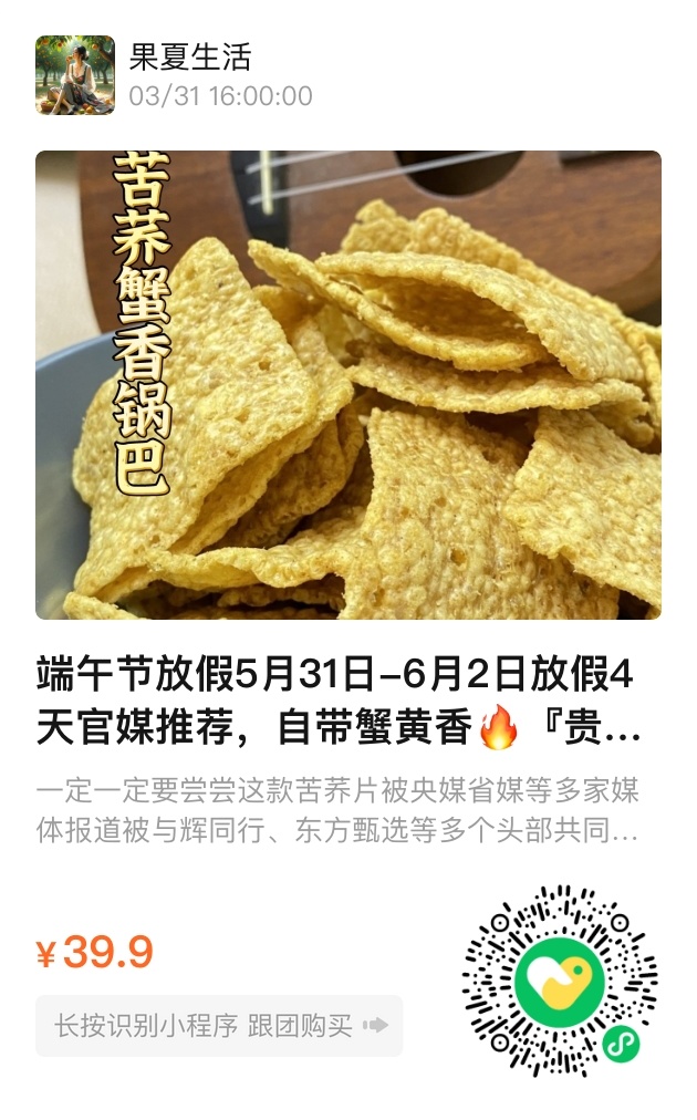 端午节将至(5月31日-6月2日放假),不妨让这盒锅巴成为旅途伴侣。限时活动中,每一盒都是独立拉链包装,113g的分量足够装满背包与欢愉。
