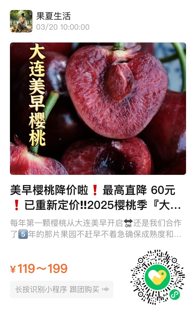 翻开《本草纲目》,会发现李时珍早已为樱桃写下“调中益脾”的朱批。大连农科所从美国引进的美早品种,却在北纬39度的黄金纬度上演着东方奇迹:昼夜温差雕琢出的糖分比普通樱桃高出8%,有机肥滋养的果肉脆嫩无渣,就连果柄都青翠得像刚折下的柳枝。若把进口车厘子比作盛装赴宴的贵族,这沐浴着黄海雾霭长大的美早,便是提着裙摆从果园直接闯进你厨房的野丫头——带着晨露的莽撞生机,甜得理直气壮。
