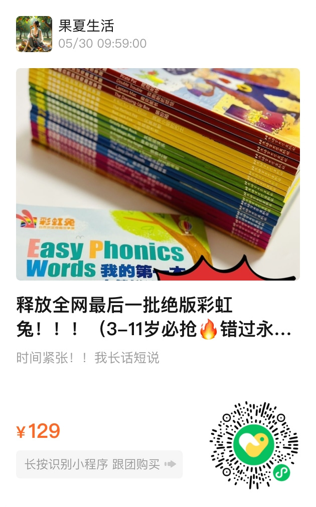 总结:来自凯迪克的绝版彩虹兔自然拼读套装(23册),以英伦经典拼读体系为核心,通过22个阶梯式故事+1本音素词典,用童话智慧破解英文拼读密码。支持毛毛虫点读笔,现存最后一批官方库存,原版音频同步赠送。