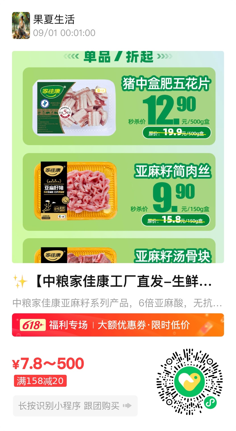 现在下单享满158减20优惠,顺丰冷链直达,泡沫箱加干冰锁鲜包装,确保新鲜到家。中粮家佳康用央企品质践行承诺,让健康从源头开始,陪伴每一顿安心餐食。