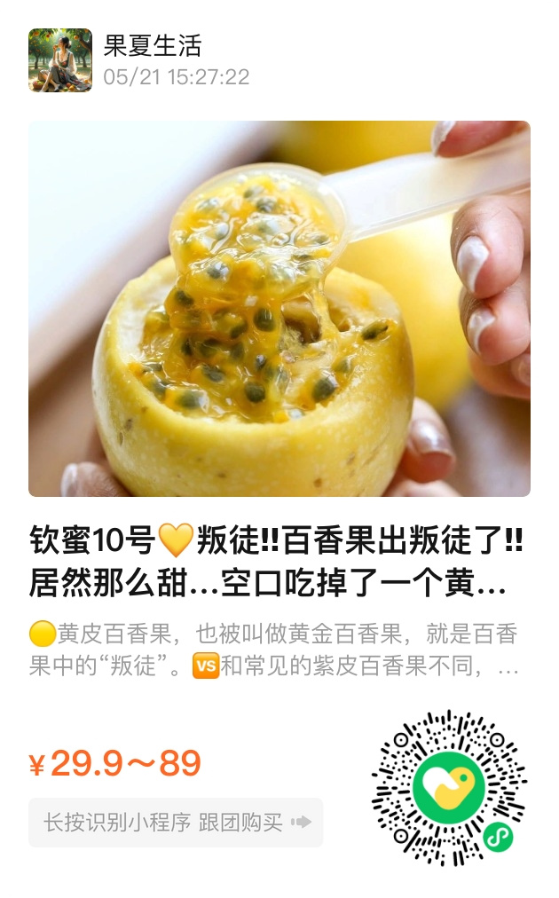 总结:这颗产自海南的钦蜜10号黄金百香果,用20.5度的自然甜颠覆传统认知,果肉饱满多汁,九分甜意里藏一分活泼酸香。随成熟度变化的风味,让鲜食或特调都充满可能,是自然馈赠的天然甜味剂。