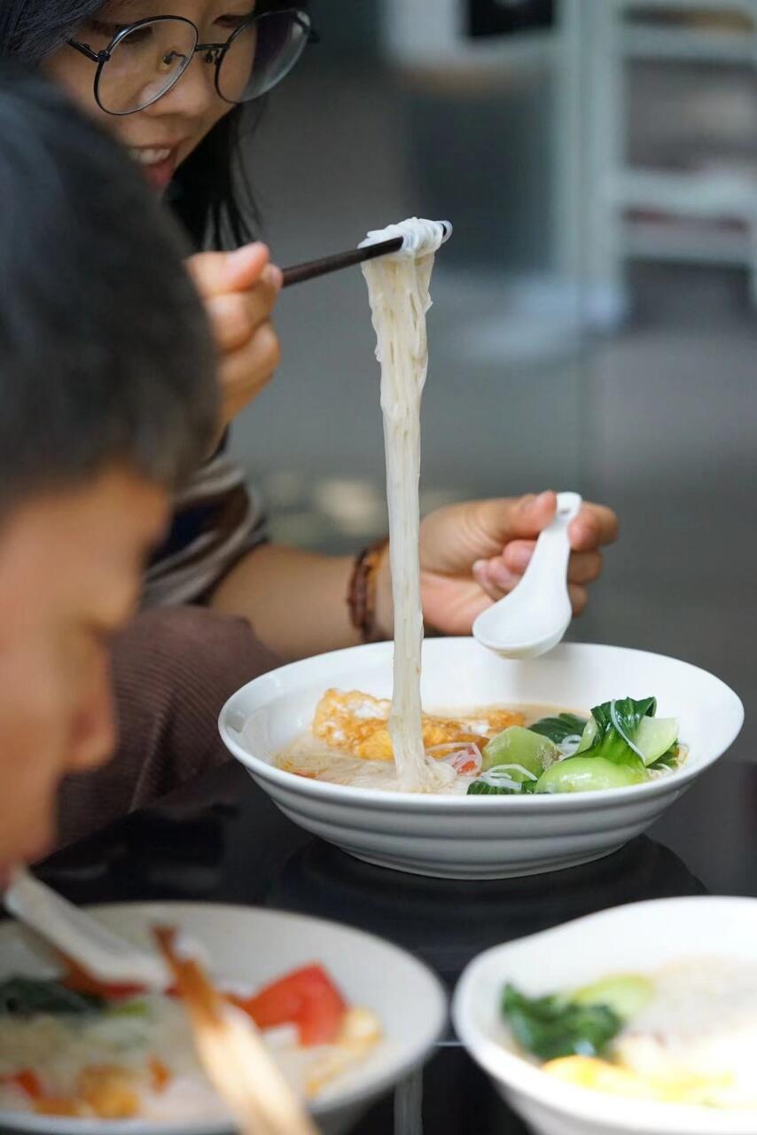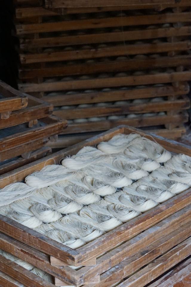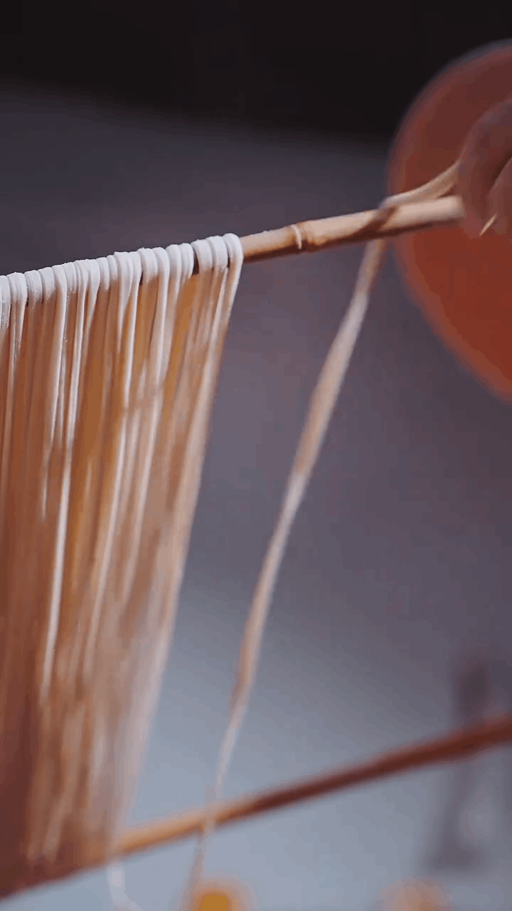 机器面线十分钟就能量产,可手工的韧性来自时间的馈赠。竹匾上反复缠绕的面条,像被春风撩动的琴弦,在甩、拉、绕之间伸展成三十二米的温柔。晾晒时,阳光为它镀上金边,空气里浮动的面香,是工业流水线永远无法复制的乡愁。老一辈人说,真正的手工面线会“呼吸”,煮时软糯不糊,入口即化,却能在唇齿间留下麦芽糖般的回甘。