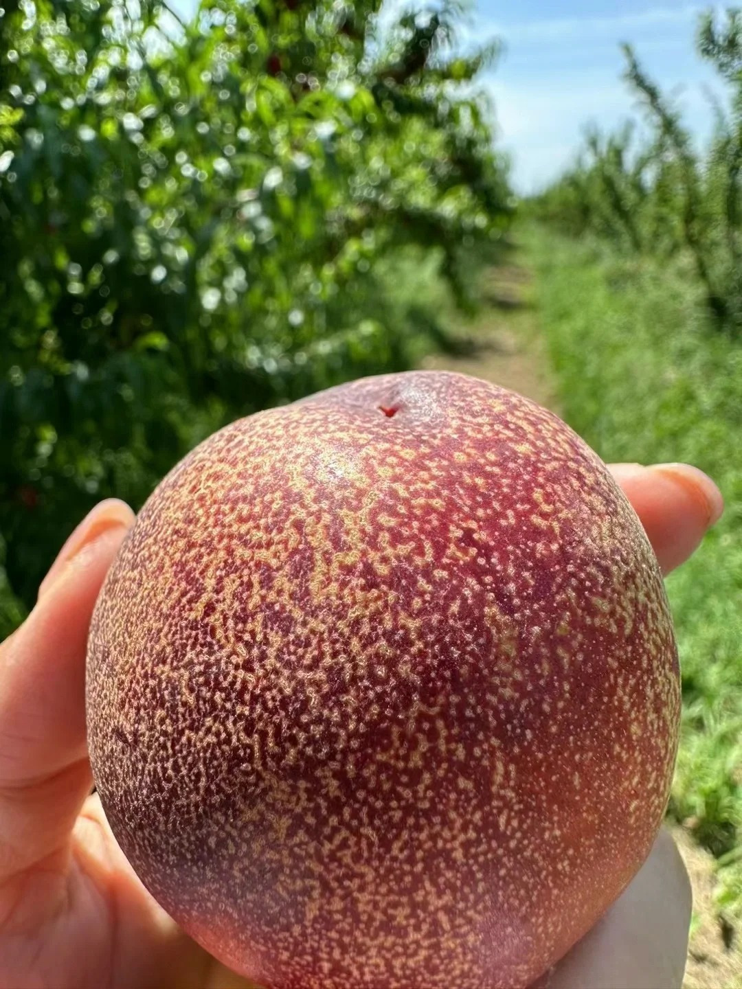 这颗油桃的脸蛋儿可不太光滑,布满了“麻点”,像极了小时候外婆脸颊上的晒斑,可偏偏这“丑模样”藏着最动人的甜。黄河故道的沙土地,几百年来沉淀着黄河携带的矿物质,钙、钾悄然渗透进果肉,砀山的桃农笑着称这是“天上仙桃落凡间”。你知道吗?沙土地种桃有个奇妙之处——白天吸热快,夜晚散热快,昼夜温差像一双无形的手,把糖分一点点揉进桃子里。今年老天爷格外吝啬雨水,反倒让这批桃攒足了劲儿,甜度轻松飙到16+,咬开硬脆的果肉,甜中带一丝俏皮的酸,像极了生活该有的样子。