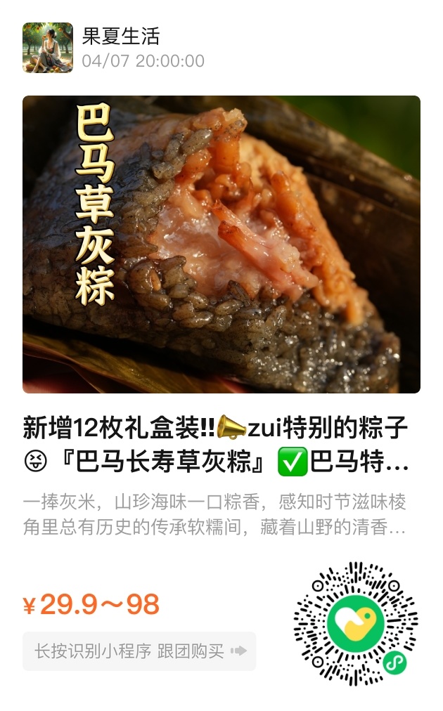 每逢端午,总想找点不一样的味道。这款巴马长寿草灰粽,或许能给你惊喜。它灰扑扑的外表下,藏着山野的馈赠——香草灰浸润的糯米,搭配土猪五花肉、软糯板栗和清甜脱皮绿豆,每一口都是自然与匠心的融合。很多初次尝试的朋友,都会惊讶于它的清爽口感,不腻不燥,连肠胃也倍感轻松。