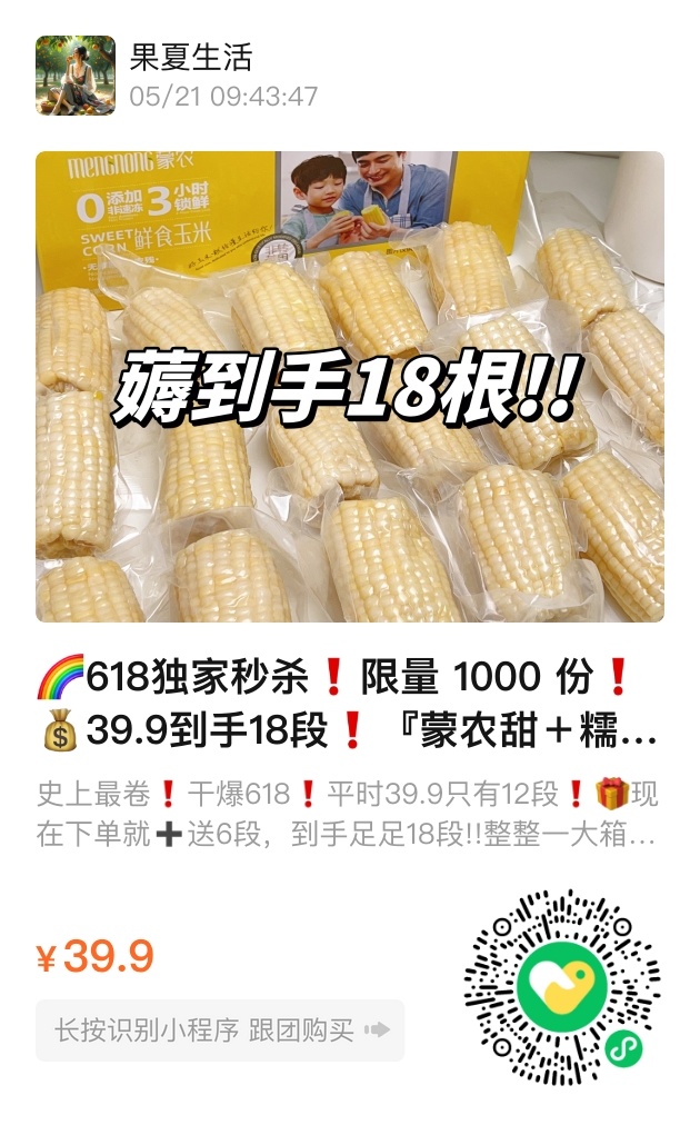 今年的618,我们想用最实在的方式回馈一直支持蒙农的朋友们。原本39.9元12段的甜糯玉米,现在加送6段,整整18段塞满一大箱!这不是简单的促销,而是希望能让更多人尝到这份草原的滋味。市场上的玉米或许便宜,但蒙农的特别在于:它是真的值得。甜度翻倍、嫩度满分,连挑食的孩子都会抢着吃。或许您会担心“限量”只是噱头,但内蒙应季玉米的产量有限,这一批卖完,下一季的鲜嫩又要再等一年。