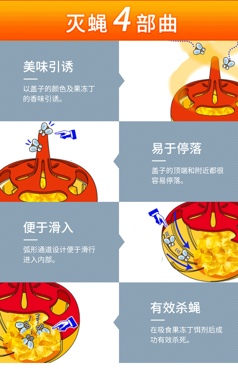 而小橘帽灭蝇饵剂更像仲夏夜的童话陷阱。日本匠人深谙果蝇偏爱橙色的天性,将容器做成暖橘色灯笼模样——那是小飞虫眼中的蟠桃宴,却暗藏螺旋通道的”八阵图”。果蝇们循着甜香赴宴,便再难寻归来路。这让人想起陶渊明笔下”飞蛾恋明烛”的宿命,只是小橘帽用现代科学改写了结局。百年药企安速的智慧,就在这方寸间的温柔杀伐中。