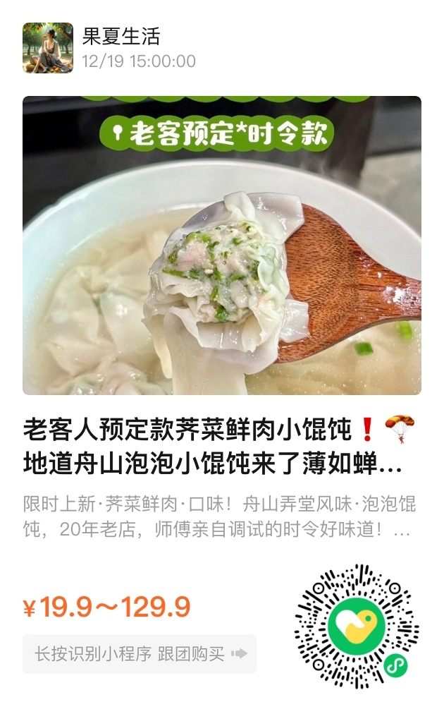 限时尝鲜:舟山老师傅亲制荠菜鲜肉泡泡馄饨,每盒40只赠灵魂配料,江浙沪包邮,其他地区仅需补8元运费。