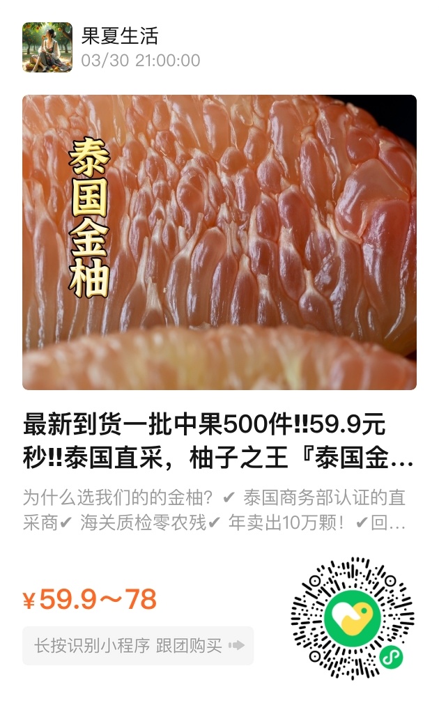 现在这批乘着EMS航班飞来的热带小太阳,正在用59.9元的诚意价叩响你的果盘。5年才能结果的金柚,带着泰国商务部认证的零农残报告,以及90%回购率的味觉承诺。随手剥开一颗,果肉脆嫩得像踩着蓬松云朵,爆汁时连空气都染上蜜糖色。当代人太需要这样的仪式感——不必飞去清迈,也能在剥柚子的五分钟里,触碰到赤道线上最温柔的阳光馈赠。