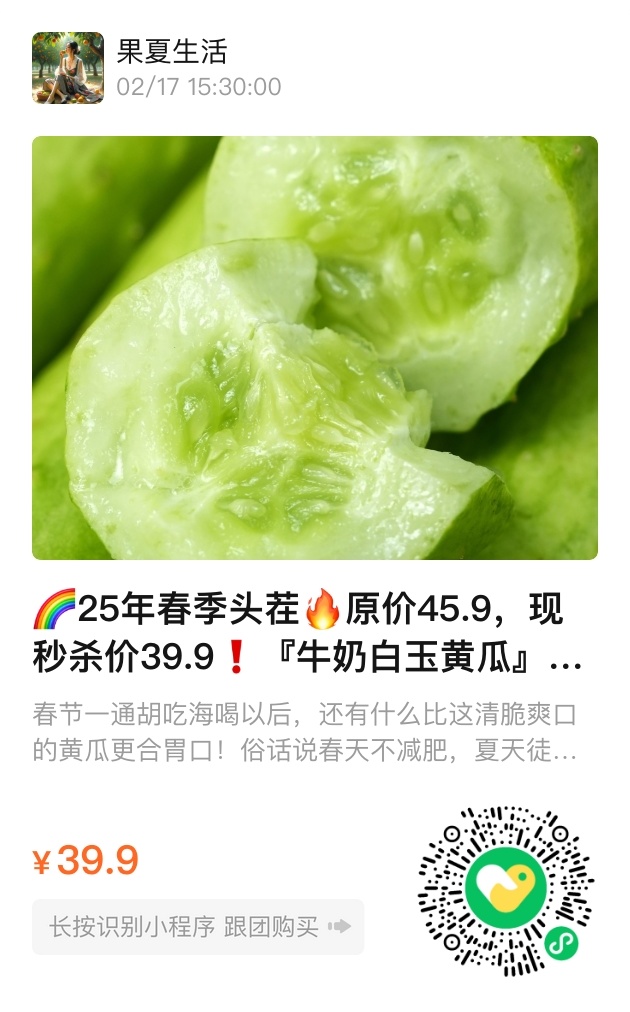 活动期间,这款国宴级别的春日尤物从45.9元直降至39.9元。不妨试试切片淋蜂蜜当下午茶,或是拌成轻奢沙拉犒劳加班的夜。快递正带着胶东风味飞奔而来,但记得:最好吃的黄瓜永远带着泥土的温度,就像最动人的生活,总藏在知识与烟火气的碰撞处。——这颗用牛奶养大的白玉脆瓜,正是春天写给肠胃的一封情书。