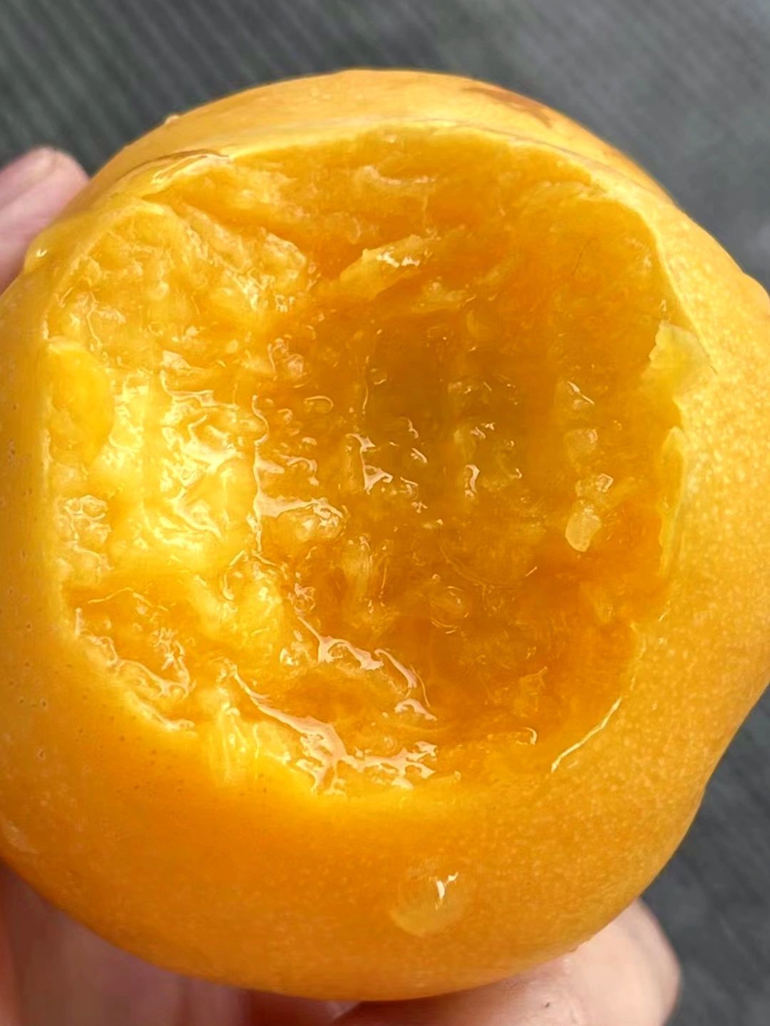 油桃的可爱在于它“不矫情”。不用和绒毛斗智斗勇,清水一冲就能连皮啃。硬吃时咔嚓脆响,是夏天活泼的鼓点;放软后汁水丰沛,又成了温柔的抒情曲。果园里套袋生长的黄油桃,像被阳光吻过的蜜罐子,果肉撑满九成空间,连挑剔的软桃党与脆桃党都能在此握手言和。蒙阴的黄土与晴雨将它养得通体金黄,仿佛把整个夏天的灿烂都封存在了果肉里。
