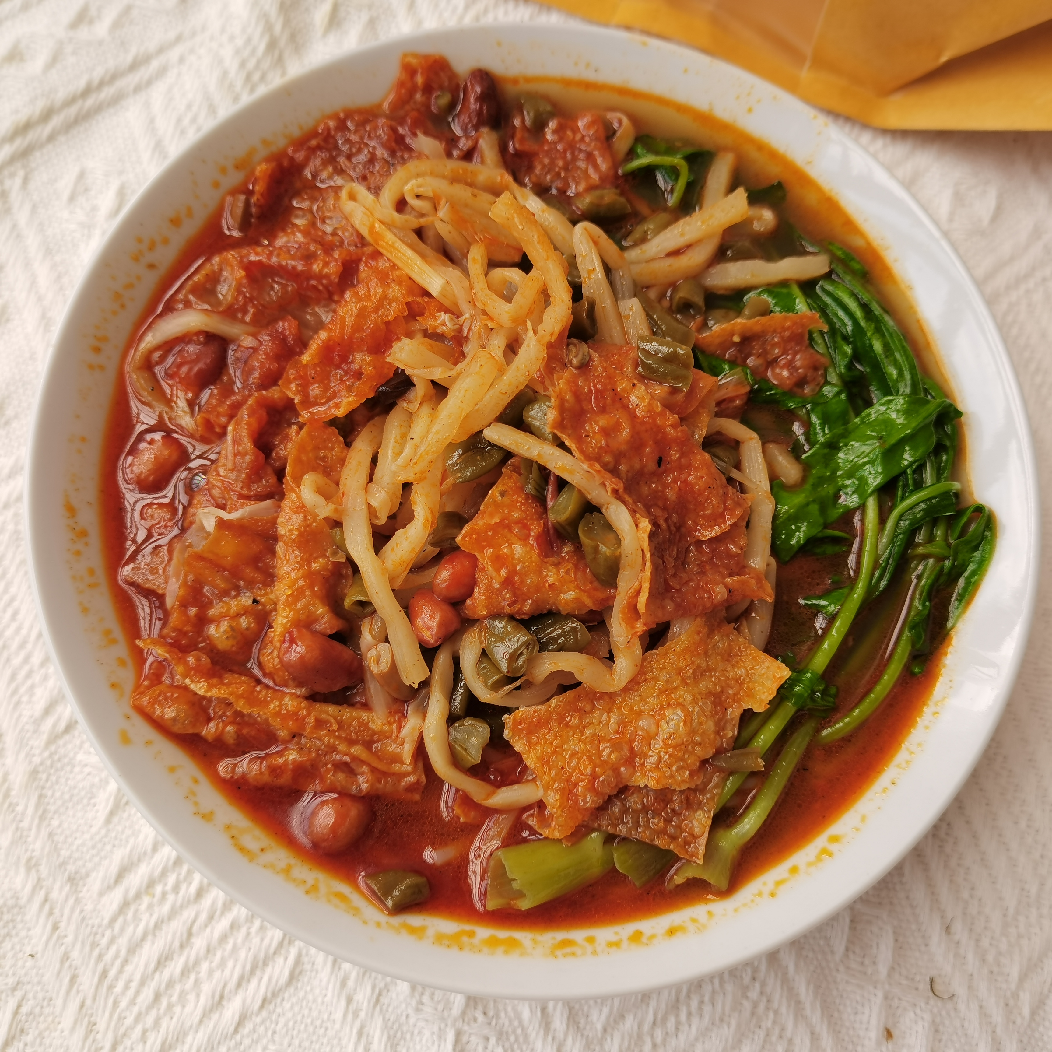 幽默藏在细节里:广西人嗦粉讲究“粉要韧,汤要浑”,连汤底都能喝光的,才是行家。这碗粉的腐竹像刚炸好的云片,花生脆得能听见阳光的味道,酸豆角咬下去会咯吱笑着反驳“我可没加防腐剂”。就连醋包里都藏着蒜米和小米辣的暗号,仿佛在说:“嘿,这才是生活该有的棱角!”老祖宗的智慧早就写在《齐民要术》里:好味的真谛,无非是“食不厌精,脍不厌细”。那些用螺蛳膏糊弄的速食粉,像极了背不出课文就抄同桌作业的学渣。
