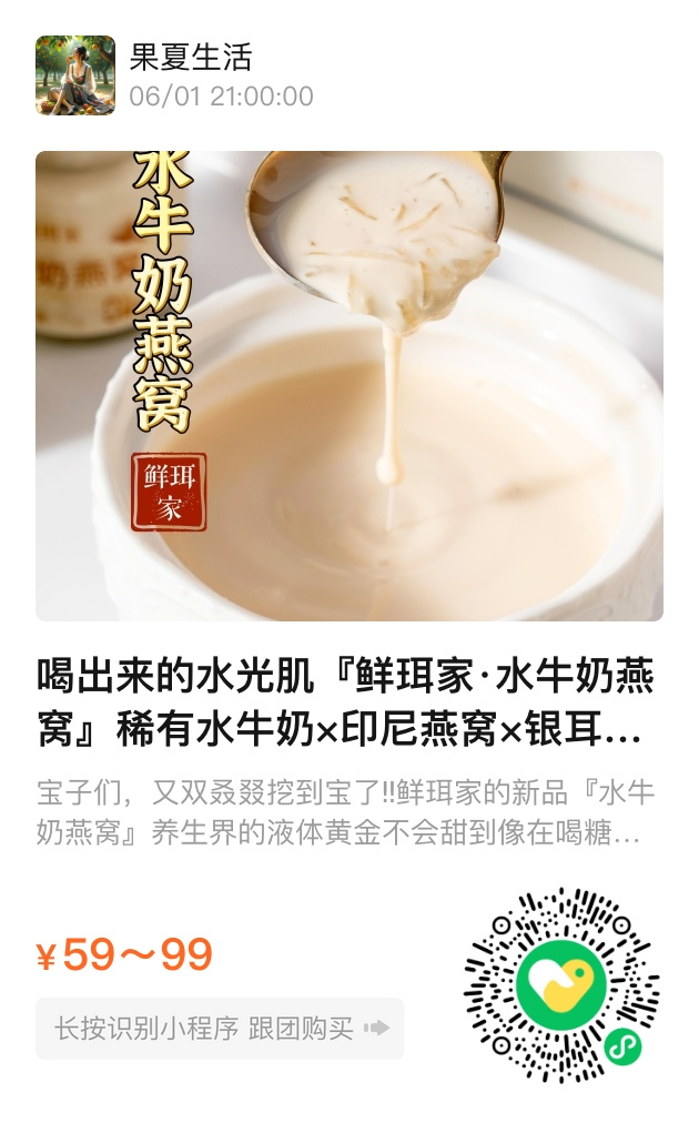 鲜珥家实验室的显微镜下,每克燕窝唾液酸都闪耀着抗氧化的微光,水牛奶的EGF生长因子正悄然唤醒皮肤记忆。这罐75g的「液体黄金」把牧童的短笛、采燕人的晨露、银耳破土而出的生机,统统封印在八边形玻璃瓶里。现在下单即赠古法甜品食谱册,买两箱附赠故宫纹样隔热餐垫——让六百年的美学守护此刻的养生仪式。