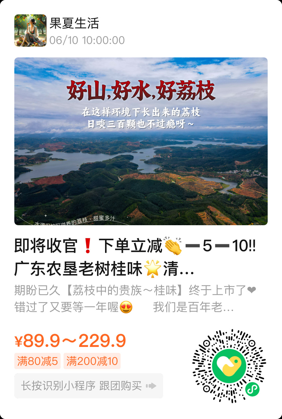 活动最后48小时!满80减5,满200减10。错过这轮,再品桂味需待来年。来自高州平山镇的馈赠,农垦质检背书的甜蜜,愿为您的盛夏添一份值得回味的岭南风雅。