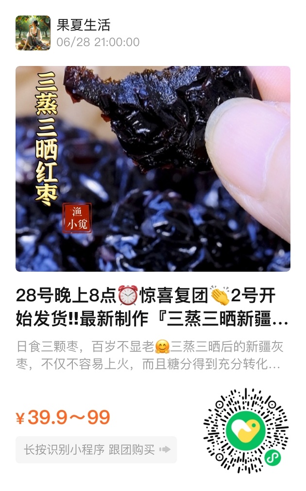总结:遵循古法三蒸三晒的新疆灰枣,以柴火灶慢工软化枣皮,更易吸收且不上火。源自喀什的天然甜糯,适合日常调养气血,复团活动28日晚8点开启。