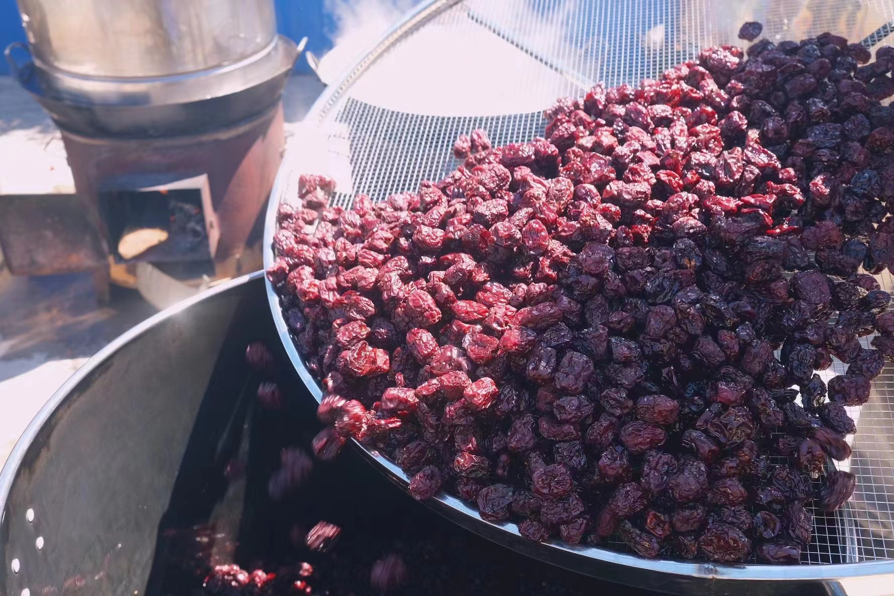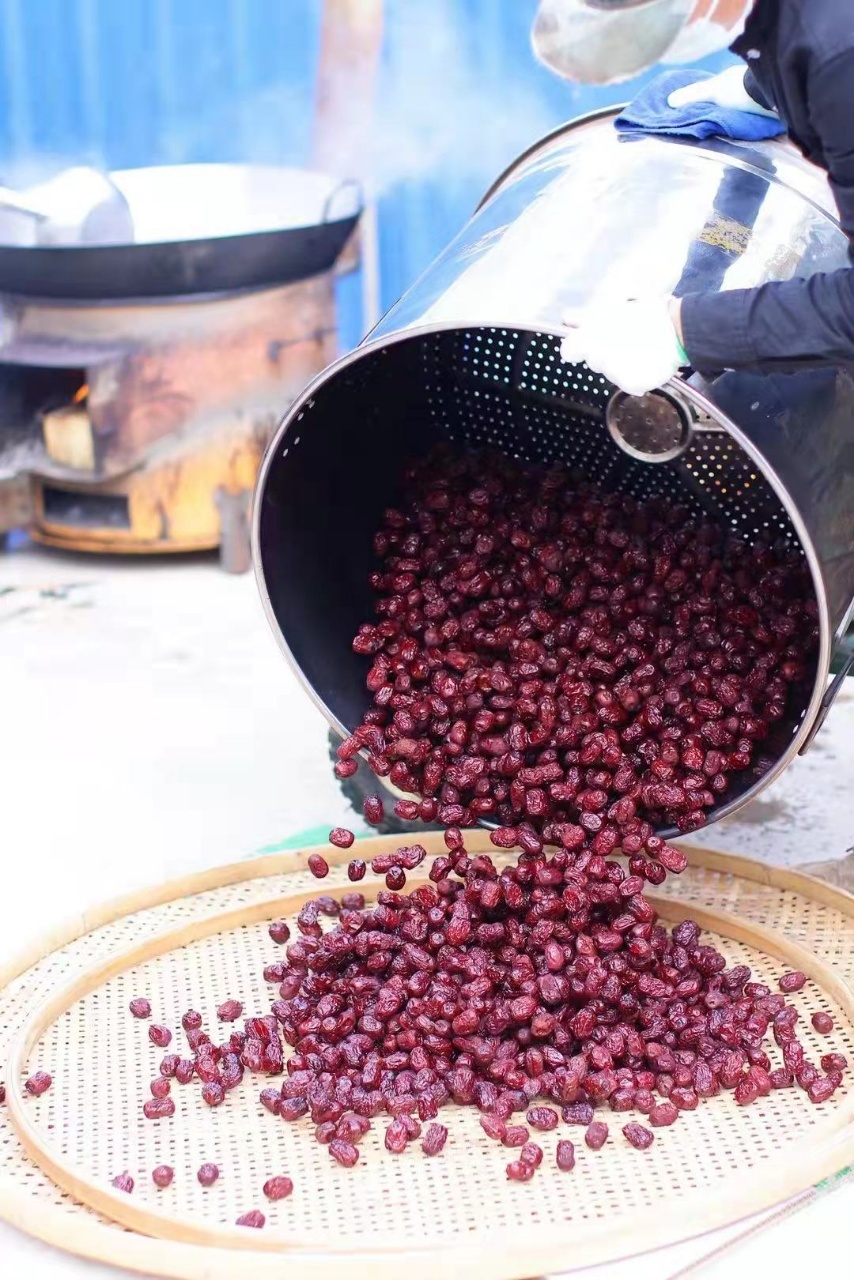 柴火灶上的铁锅咕嘟作响,水汽裹着枣香漫过晒棚。喀什的烈日与沙漠的风,早把灰枣炼得糖心透亮,而三次蒸晒的古法,又让它褪去生涩。枣皮在蒸汽里软化,纤维素化作绕指柔,连脾胃虚弱的人也能品得这份甜糯。像《本草纲目》里写的”枣为脾之果”,这抹枣红从不张扬,只是静静地陪着你,在加班疲惫的深夜,在产后虚弱的清晨。