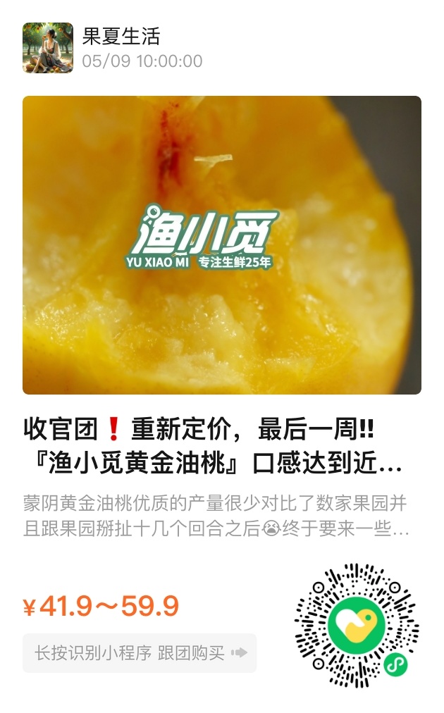 🌟活动提醒: 果园直发的黄金油桃收官团进入最后一周!现摘现发,顺丰包邮,3斤装礼盒仅限时供应。果期只剩20天,下一季的相遇要再等365天。